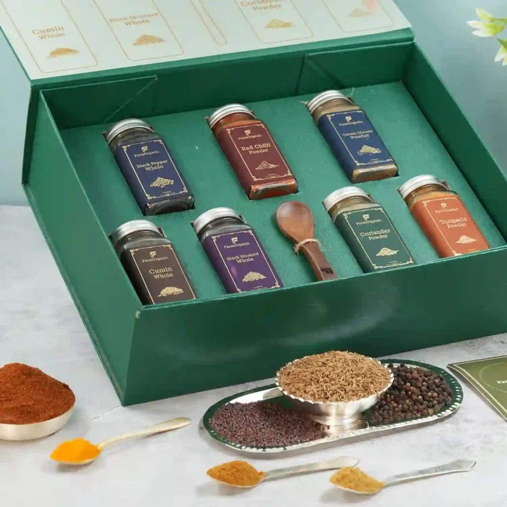 FarmOrganic Premium 7 Spice Gift Box with Red Chilli, Garam Masala, Mustard, Cumin, Coriander, Black Pepper & Turmeric in reusable glass jars. Perfect for cooking, festive & corporate gifting.